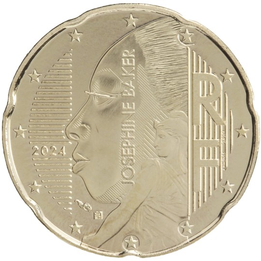 Portrait of Josephine Baker, a singer, dancer and civil rights activist. She was awarded the Resistance Medal, the Croix de Guerre and the Legion of Honour for her efforts during World War II. The portrait is set within a French flag motif, symbolizing Baker's iconic place in the French Republic, represented by the letters RF.