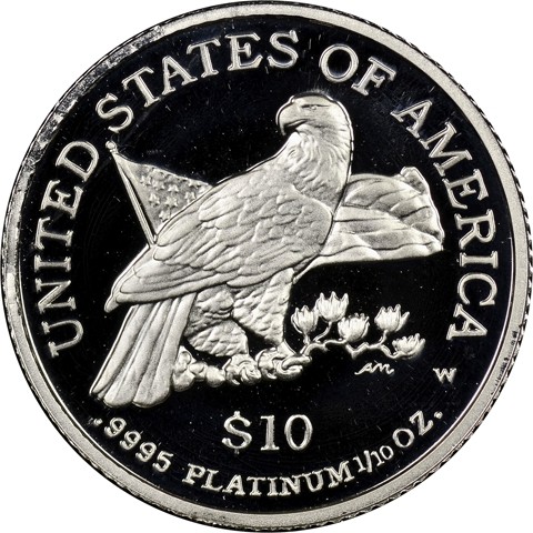 The reverse depicts a bald eagle perched on a Rocky Mountain pine branch, against a backdrop of the United States flag, above, the country name. Below the eagle, the face value $10 and the precious metal content.