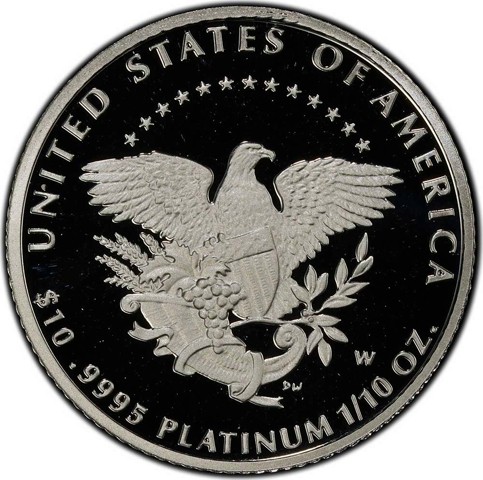 The reverse depicts an American bald eagle with outstretched wings; in front of the eagle and partly obscuring it, the Shield of the United States, in the upper of which there are thirteen stars, and in the lower thirteen stripes; in front of that, a cornucopia (:horn of plenty") with wheat stalks, grapes and a laurel branch - "representing America's strength and beauty". Around above the eagle, thirteen stars. The recurring number 13 represents the first 13 states which formed the union which later expanded to become the modern United States, above, the country name. Below the eagle, the face value $10 and the precious metal content.