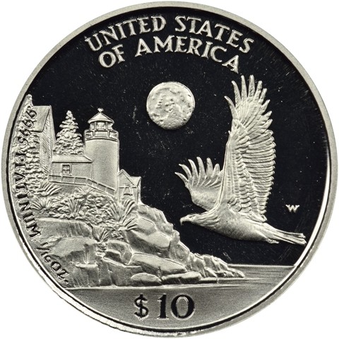 The reverse depicts a bald eagle flying over New England, represented by a rocky beach on which part of a town is visible, with old-style houses with the tower of a small light house; there is a full moon in the sky. above, the country name. In the exergue, the face value $10.