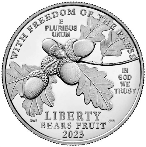 obverse design portrays the branch of a mature oak tree with acorns amid the inscription “WITH FREEDOM OF THE PRESS LIBERTY BEARS FRUIT.” Additional inscriptions are “IN GOD WE TRUST,” “E PLURIBUS UNUM,” and “2023.”
