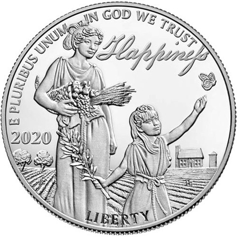 The obverse design of the 2020 coin depicts Lady Liberty harvesting the fruits of her labor with a young girl at play nearby. The overflowing cornucopia she carries is a symbol of the physical, intellectual, and spiritual bounty only liberty makes possible—the good things that nourish the body, enliven the mind, and satisfy the soul. The home, orchard, and silo represent American hopes, values, and aspirations and bring to a close the narrative told throughout the backgrounds of the series—from furrowed earth, to prairies and mountains, and finally to an agrarian field. The stubble field alludes to the ingenuity and exertion required to claim liberty's promise. Obverse inscriptions are "E PLURIBUS UNUM," "IN GOD WE TRUST," "Happiness," "2020," and "LIBERTY." The inscription "Happiness" is a facsimile of the handwritten word from the Declaration of Independence and includes the long "s," a letterform that was typical of its time but is no longer in common use.