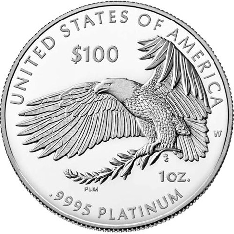 The common reverse design for coins in this series depicts an eagle in flight with an olive branch in its talons. Inscriptions are "UNITED STATES OF AMERICA," "$100," "1 OZ.," and ".9995 PLATINUM."