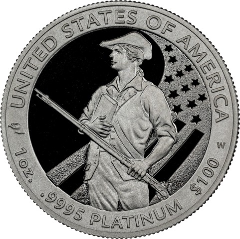The reverse depicts a vigilant minuteman from the Revolutionary War, representing the protection and defense of the country during its early days. The minuteman carries a rifle and a book, which symbolizes the importance of knowledge in defending the nation. In the background, the United States flag.", above, the country name. Around below the precious metal content followed by the face value $100.