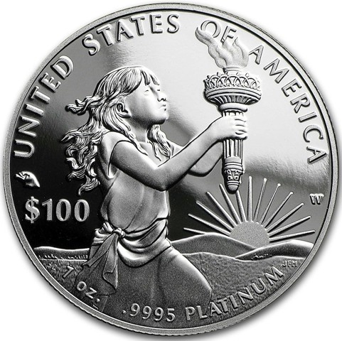 The reverse depicts Young Lady Liberty (depicted as a child) carrying a torch symbolizing the hope and promise of America. In the background, hills and the rising sun., above, the country name. Below that, the face value $100. Around below the precious metal content.