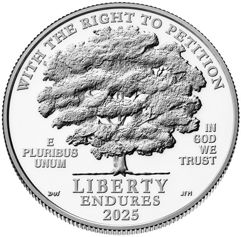 The obverse design features a mature, spreading, impressive oak tree between the inscription “WITH THE RIGHT TO PETITION LIBERTY ENDURES.” The oak, known for its strength, can live up to 200 years and is a symbol of endurance. Additional inscriptions are “E PLURIBUS UNUM,” “IN GOD WE TRUST,” and “2025.”