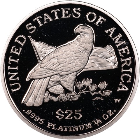 The reverse depicts a bald eagle perched on a Rocky Mountain pine branch, against a backdrop of the United States flag, above, the country name. Below the eagle, the face value $25 and the precious metal content.