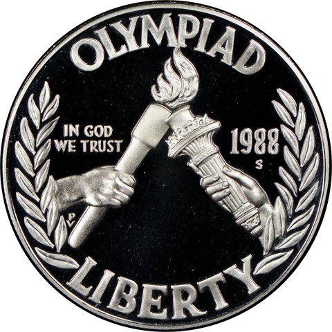 obverse design for the coin features one hand holding the Statue of Liberty’s torch and the other holding an Olympic torch. The two flames merge together with olive branches framing the scene. The inscriptions “Olympiad” and “Liberty” appear above and below, with “In God We Trust” and the date “1988” to each side.