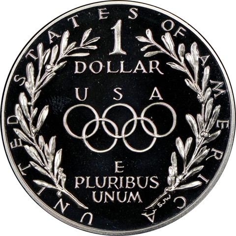 On the reverse, the Olympic rings appear centrally with “USA” above and another pair of olive branches framing the scene. The inscription “United States of America” appears widely spaced around the edge of the coin. The denomination is expressed as “1 Dollar” and “E Pluribus Unum” appears near the base.