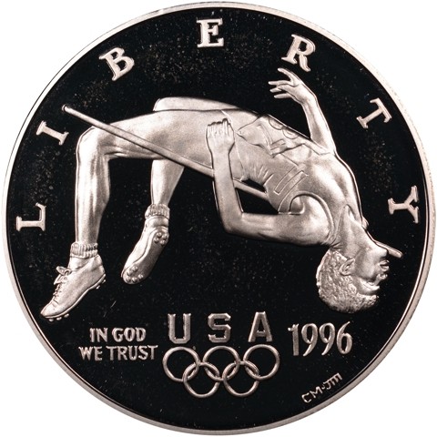 The obverse design features an athlete doing the Fosbury Flop high jump technique.