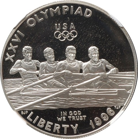 The reverse of the U.S. Olympic Rowing Silver Dollar features the mark of the Atlanta Committee for the Olympic Games which is positioned to the left of the design, a torch and flame, and the words Atlanta 1996.