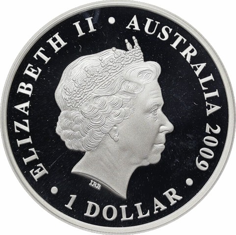 Fourth crowned portrait of HM Queen Elizabeth II facing right, wearing the Girls of Great Britain and Ireland tiara. surrounded by the inscriptions “ELIZABETH II,” “AUSTRALIA, 2009,” and the face value “1 DOLLAR.”