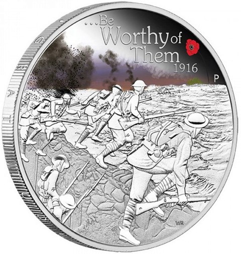 This coin's reverse depicts infantrymen “go over the top” in trench line on the battlefield of the Somme in France and a mine explotion at the left side, giving the design a complete and harmonious look. The design includes the inscription ‘....Be Worthy of Them’ above, a red poppy motif at the right side. In the right field, The Perth Mint’s traditional ‘P’ Mint Mark appears and the the designer's initials (WR) at the opposite below right on a trench.