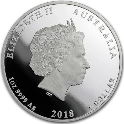 Fourth crowned portrait of HM Queen Elizabeth II facing right, wearing the Girls of Great Britain and Ireland tiara. surrounded by the inscriptions “ELIZABETH II, AUSTRALIA, face value "1 DOLLAR" – date "2018," metal, purity and weight "1oz 999 SILVER.”