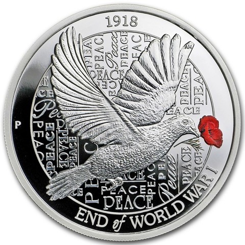 The coin’s reverse portrays a dove, which has become an international symbol of peace. In its beak, the bird is carrying a red poppy, another poignant symbol. Red poppies were the first flowers to bloom in the devastated battlefields of Western Europe and are now linked with European remembrance ceremonies of World War I. Behind the dove, the word “peace” is written in different fonts. On top of the coin, the inscription: "1918" - the year of the war. On the bottom, the inscription: "END OF WORLD WAR I" - the name of the coin. In the left field, The Perth Mint's traditional "P" mint mark and the designers initials “AH” feature in the upper feather of dove's wing.