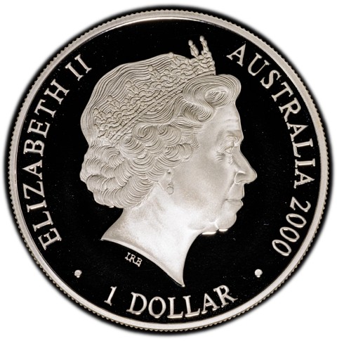 Fourth crowned portrait of HM Queen Elizabeth II facing right, wearing the Girls of Great Britain and Ireland tiara. framed by inscriptions ELIZABETH II, AUSTRALIA, 1 DOLLAR, 2000. Denomination and the coin's date of mintage inscribed below.