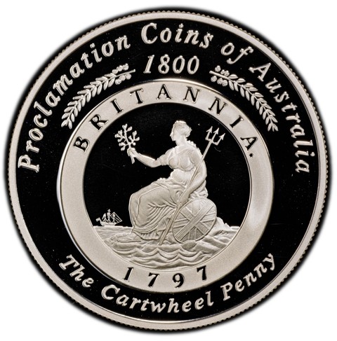 The reverse depicts a stylized depiction of The Cartwheel Penny coin (features bears the iconic seated Britannia. This portrait of Britannia is now shown holding a trident rather than a spear as shown on previous coins. Britannia is seated on a rock with waves surrounding her, holding an olive branch. There is a shield showing the Union Flag. In the background shows a boat sailing. The legend reads "BRITANNIA - 1797") surrounded by inscription identify the theme "Proclamation Coins of Australia" with date 1880 dividing two olive branches around above and "The Cartwheel Penny" around below.