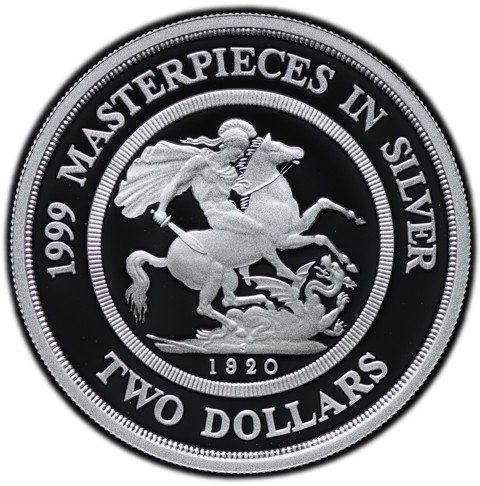 The coin reverse features St. George on horseback holding a short sword, the horse rearing to right over a fallen dragon which has a broken lance in its chest, date below within a circle surrounded by a legend stating "1999 MASTERPIECES IN SILVER" - the coin name - around above and the face value "TWO DOLLARS" below.