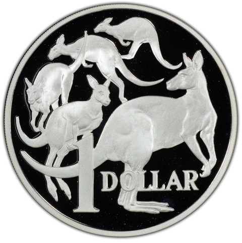 The reverse depicts five kangaroos (known as the Mob of Roos), the closest facing right but looking to left. Below, and overlaid on them, the denomination and face value "1 DOLLAR."