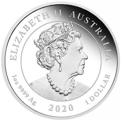 6th crowned portrait of HM Queen Elizabeth II facing right (the Commonwealth effigy), wearing the George IV State Diadem, the Coronation Necklace and Earrings framed by inscriptions “ELIZABETH II,” “AUSTRALIA,” above, weight, purity, and metal content "1oz 9999 Ag" and 1 DOLLAR, and the coin's mintage year, "2020" below.
