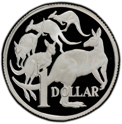 The reverse depicts five kangaroos (known as the Mob of Roos), the closest facing right but looking to left. Below, and overlaid on them, the denomination and face value "1 DOLLAR."