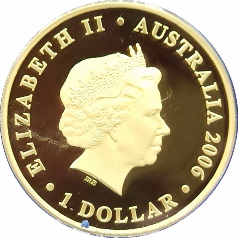 Fourth crowned portrait of HM Queen Elizabeth II facing right, wearing the Girls of Great Britain and Ireland tiara. surrounded by the inscriptions “ELIZABETH II,” “AUSTRALIA, 2006” and the face value “1 DOLLAR.”