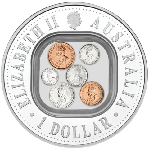 Fourth crowned portrait of HM Queen Elizabeth II facing right, wearing the Girls of Great Britain and Ireland tiara. Below the effigy, reproduction obverse of the King George V portrait pre-decimal Australian coins (1931 Florin, 1916 Shilling, 1926 Sixpence, 1936 Threepence, 1935 Penny and 1934 Halfpenny) surrounded by ELIZABETH II, AUSTRALIA" and the denomination “1 DOLLAR.”