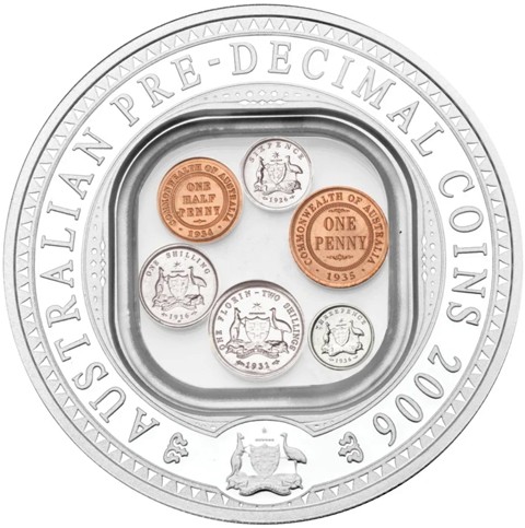 The reverse design shows the reverse of King George V Australian coins (1931 Florin, 1916 Shilling, 1926 Sixpence, 1936 Threepence, 1935 Penny and 1934 Halfpenny) surrounded by inscription "AUSTRALIAN PRE-DECIMAL COINS 2006" and Australian Coat of Arms (the kangaroo, emu and the shield containing the coat of arms. Those issued between 1910 and 1936 have a seven-pointed star above the coat of arms, and the Southern Cross constellation within the shield.) below. The Perth Mint's 'P' mintmark is not included.