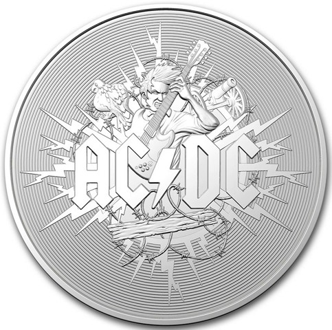The reverse of the coin depicts a design inspired by art from the past album covers of AC/DC. The coin features the iconic parrot from the "Dirty Deeds Done Dirt Cheap" cover, the cannon from the "For Those About to Rock" album, barbed wire from the "High Voltage" cover, and a plank of wood from the "T.N.T." album. On the center of the reverse, the inscription: "AC/DC" - the name of the band and of the coin. The background is a pattern of fine concentric circles representing the grooves on a vinyl record.