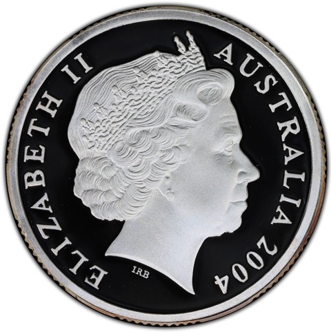 Fourth crowned portrait of HM Queen Elizabeth II facing right, wearing the Girls of Great Britain and Ireland tiara, framed by inscriptions ELIZABETH II, AUSTRALIA, and the coin's mintage year, "2004" below.