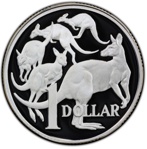 The reverse depicts five kangaroos (known as the Mob of Roos), the closest facing right but looking to left. Below, and overlaid on them, the denomination and face value "1 DOLLAR."