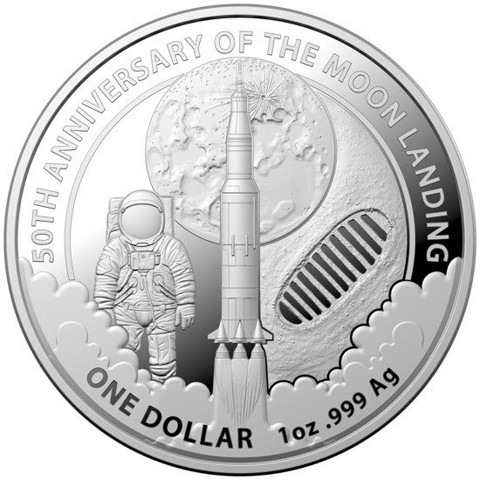 shows the most important symbols associated with the Apollo 11 mission. The central reverse side captures the Apollo 11 rocket taking off against the backdrop of the moon. The right edge is decorated with an Aldrin's boot print left on the moon. The left edge is decorated with the figure of an astronaut in a spacesuit. The whole is surrounded by the inscription " 50TH ANNIVERSARY OF THE MOON LANDING" and such information as the face value, weight of the coin and the bullion sample.