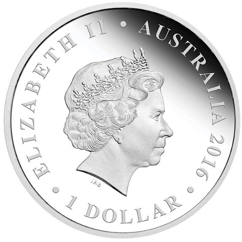 Fourth crowned portrait of HM Queen Elizabeth II facing right, wearing the Girls of Great Britain and Ireland tiara. surrounded by the inscriptions “ELIZABETH II,” “AUSTRALIA, 2016,” and the face value “1 DOLLAR.”