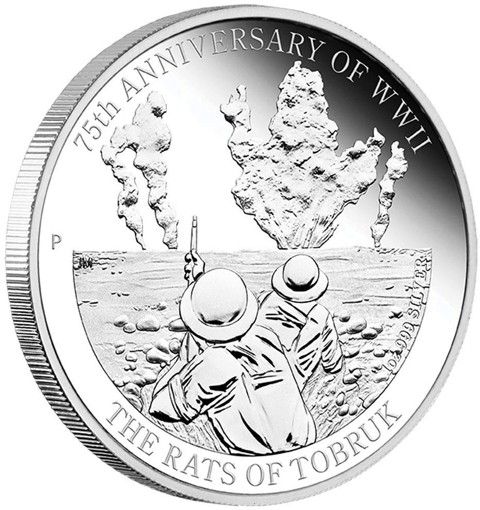 The reverse presents two soldiers (who defended the Libyan port of Tobruk in 1941, earning the nickname “Rats of Tobruk” for their resilience under siege) in helmets inside a trench, observing the battlefield where explosions rise dramatically in the background. Around the edge are inscriptions: 75th ANNIVERSARY OF WWII and THE RATS OF TOBRUK. The Perth Mint’s “P” mintmark is placed on the left side and the designer's initials (NM) below it. The coin’s metal, weight and purity"1oz 999 Silver," is inscribed on the right side.