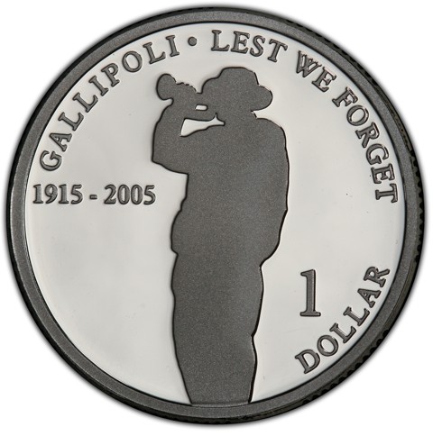 The reverse depicts a silhouette ANZAC's soldier 'digger' in his slouch hat with a bugle. The inscription identify theme "GALLIPOLI·LEST WE FORGET" around above and face value "1 DOLLAR" right below.