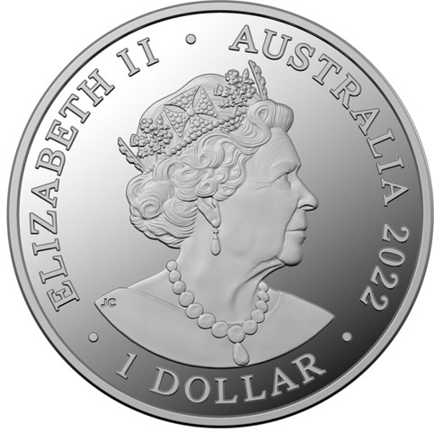 6th crowned portrait of HM Queen Elizabeth II facing right (the Commonwealth effigy), wearing the George IV State Diadem, the Coronation Necklace and Earrings framed by inscriptions “ELIZABETH II,” “AUSTRALIA, 2022,” and the face value “1 DOLLAR.”