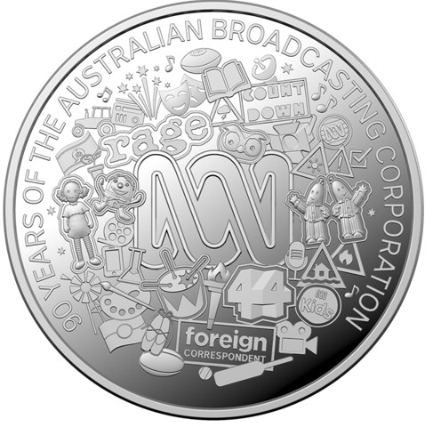 The coin's reverse features the iconic ABC lissajous logo (Designed by Bill Kennard, the geometric waveform represents a signal, mimicking an oscilloscope pattern commonly used by engineers for tuning equipment) surrounded by more than forty characters, titles and pictograms symbolizing the diverse and expansive facets of Australia's national broadcaster. These include Rage - Australia's longest-running TV music show, characters such as Play School Jemima and Humpty, Four Corners, Bananas in Pyjamas and many more. The inscription "90 YEARS OF THE AUSTRALIAN BROADCASTING CORPORATION" around the rim.