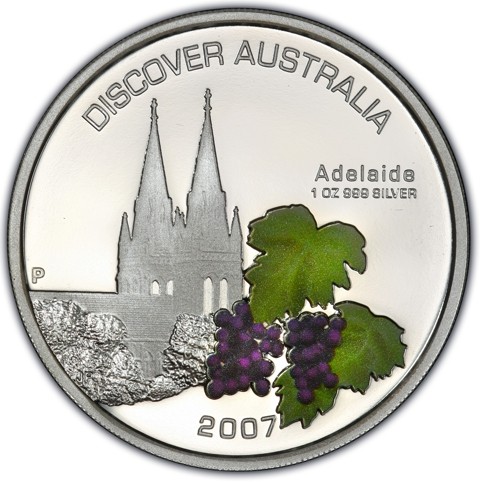 The reverse displays the famous fruit of Adelaide, two violet bunces of Autumn Royal Seedless Grape with green leaves in the foreground and silhouette of the south front of St Peter's Cathedral surrounded by trees. Around the edge are inscriptions DISCOVER AUSTRALIA – Adelaide– 2007 – 1 oz 999 SILVER. In the left field, the designer's initials (JR ) appears discreetly below The Perth Mint's "P" mint mark.