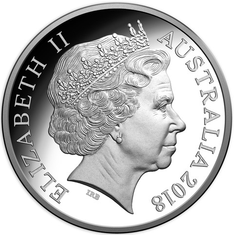 Fourth crowned portrait of HM Queen Elizabeth II facing right, wearing the Girls of Great Britain and Ireland tiara within a circle surrounded by the inscriptions “ELIZABETH II,” “AUSTRALIA, 2018,” and the face value “1 DOLLAR.”