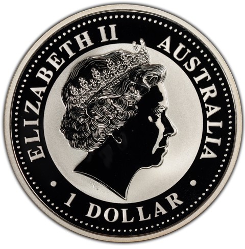 Fourth crowned portrait of HM Queen Elizabeth II facing right, wearing the Girls of Great Britain and Ireland tiara. surrounded by the inscriptions “ELIZABETH II,” “AUSTRALIA,” and the face value “1 DOLLAR.”
