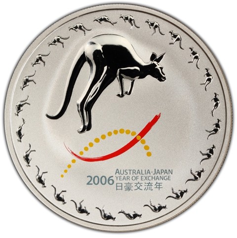 The coin’s reverse depicts a kangaroo and the 2006 Australia-Japan Year of Exchange logo in color. The logo features the stylized and interconnected letters ‘A’ and ‘J’ in the form of a yellow ochre stipple and a red oriental brushstroke. These design elements, including the inscription ‘Australia-Japan Year of Exchange’ in English and Japanese, are enclosed within a circular pattern of small kangaroos. The Perth Mint's 'P' mintmark is not included.