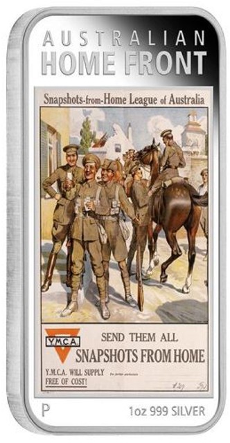 The “Send them all snapshots from home” poster was among several Australian versions of a series of posters commissioned in 1915 by the YMCA. features a colorful group of Australian soldiers in a French village smiling and passing around photographs received from home. It was one of the most effective World War I campaigns in Australia. The poster headed by the inscription AUSTRALIAN HOME LEAGUE. The coin’s metal, weight and purity "1 oz 999 SILVER" at the bottom, with a Perth Mint mark in the bottom-left.