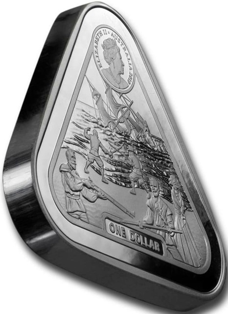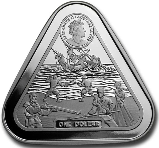 The unique, triangular-shaped coin obverse features 6th crowned portrait of HM Queen Elizabeth II facing right (the Commonwealth effigy), wearing the George IV State Diadem, the Coronation Necklace and Earrings framed by inscriptions “ELIZABETH II,” “AUSTRALIA,” and the coin's mintage year, "2018" above the scenes of chaos that plagued the survivors of the Batavia (40 of the 341 individuals on the ship perished when it capsized and a mutiny led to the deaths of another 110 men, women, and children from the ship). The ship struck a reef along the Houtman Abrolhos off the coast of Western Australia in the background. The face value “1 DOLLAR” below.