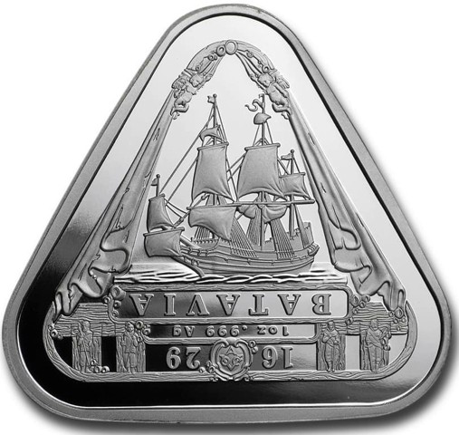 On the reverse of coin is a depiction of the Full-scale Batavia as it sailed on its maiden voyage. The border design fields incorporate design elements from the actual ship’s construction. The date of the shipwreck “1629,” the name of the ship “Batavia,” and the coin’s weight, purity, and metal content are all upside down. When flip the coin to view these elements upright, this puts the design of the Batavia itself in the position it ultimately came to rest: capsized.