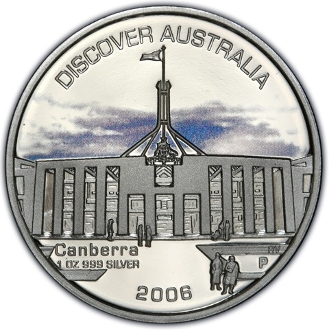 The reverse depicting Parliament House which overlooks Canberra, Australia's national capital under a colored evening sky. The series text around above, the coin's metal, weight and purity with city name in two lines below left and year of issue around below. In the right field, The Perth Mint’s “P” mintmark and the designer's initials (RV) appears discreetly below it.