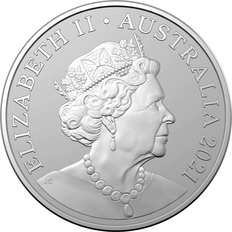 Fourth crowned portrait of HM Queen Elizabeth II facing right, wearing the Girls of Great Britain and Ireland tiara, framed by inscriptions ELIZABETH II, AUSTRALIA, and the coin's mintage year, "2021" below.