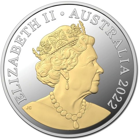 Gilded in 24-carat gold 6th crowned portrait of HM Queen Elizabeth II facing right (the Commonwealth effigy), wearing the George IV State Diadem, the Coronation Necklace and Earrings framed by inscriptions “ELIZABETH II,” “AUSTRALIA,” and the coin's mintage year, "2022" below.