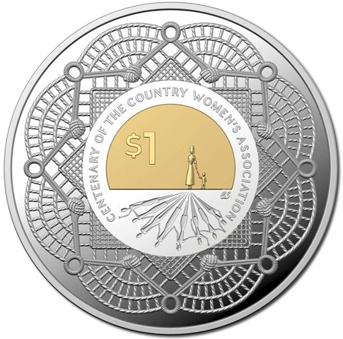 The coin reverse features a stylized crochet pattern detailed of eight pointed star with intricate patterns (Abstract mosaic shape) surrounding a gilded in 24-carat gold silhouette of a woman holding a child's hand radiating from it, eight woman-shaped shadows. On the left, the face value ($1). The designer's initials (BS) are on the right below the horizon line. The inscription identifies the theme "CENTENARY OF THE COUNTRY WOMEN'S ASSOCIATION" around above.