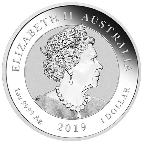 6th crowned portrait of HM Queen Elizabeth II facing right (the Commonwealth effigy), wearing the George IV State Diadem, the Coronation Necklace and Earrings framed by inscriptions “ELIZABETH II,” “AUSTRALIA,” above, weight, purity, and metal content "1oz 9999 Ag" and 1 DOLLAR, and the coin's mintage year, "2018" below.