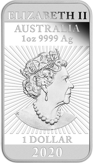 6th crowned portrait of HM Queen Elizabeth II facing right (the Commonwealth effigy), wearing the George IV State Diadem, the Coronation Necklace and Earrings framed by inscriptions “ELIZABETH II,” “AUSTRALIA,” above, weight, purity, and metal content "1oz 9999 Ag" and 1 DOLLAR, and the coin's mintage year, "2020" below.